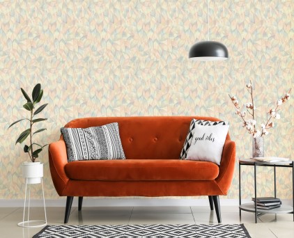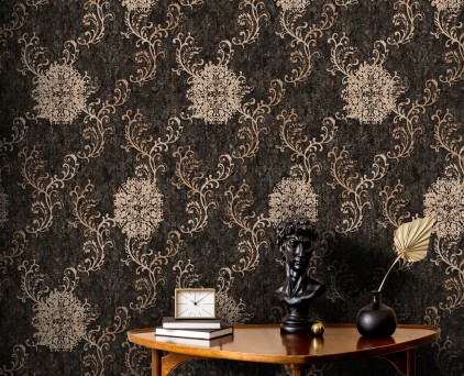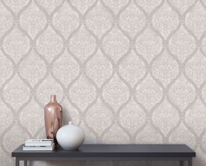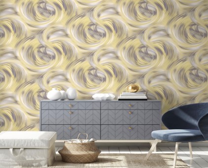 Фоновые обои нельзя обозначить как какой-то конкретный узор. Здесь можно увидеть и хаотичное движение холодных потоков воды, и срезы камня, и очертания скалистых берегов, и плотный туман на рассвете. На таком сложном базовом рисунке на декоративных полотнах добавлены ветки растений. Сами флористические элементы двух цветов, но с добавлением минимального количества серебряных блесток. Такой сложный минимализм, при правильном подборе мебели и акцентных аксессуаров, может создать интерьер в стиле не только модерн, но и романтизма.